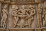 Kamasutra Szene auf der Wand eines Tempels in Khajuraho. Madhya Pradesh, Indien, (1.H. 11 JHdt.):