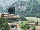 Wie ein kleines, abgelegenes Bergdorf ist das Areal in architektonisch höchstem Niveau angelegt. 41 Chalets aus Holz sprießen auf einem Betonsockel wie Pilze im Wald rund um den langgezogenen vierstöckigen Hotelbau mit seinem Turm, der ähnlich wie der Blauspitz hinter ihm, tiefschwarz in den Himmel ragt.
